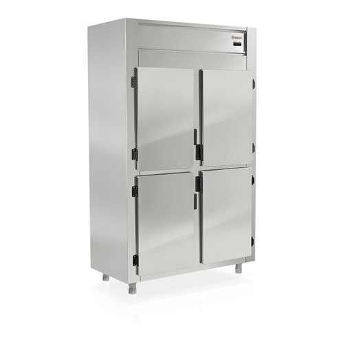 Refrigerador Comercial Inox 4 Portas GREP4P Gelopar. Geladeira comercial 4 portas inox Gelopar. Um equipamento que não pode faltar nas cozinhas de restaurantes, padarias, lanchonetes e hotéis. Refrigerador GREP4P com Controlador Eletrônico Digital, com indicador digital de temperatura e degelo automático natural. Temperatura: +1° a +°7C. Refrigeração: Ar forçado com serpentina aletada. Revestimento externo em Aço Inox 430 e interno aço Galvanizado. Pés reguláveis. 4 níveis prateleiras aramadas e reguláveis. DIMENSÕES (CxAxL): 118,3x203x66,6cm. Capacidade 1044L. Consumo 4,7kWh/dia. Peso 186kg. Câmara fria 4 Portas GREP4P